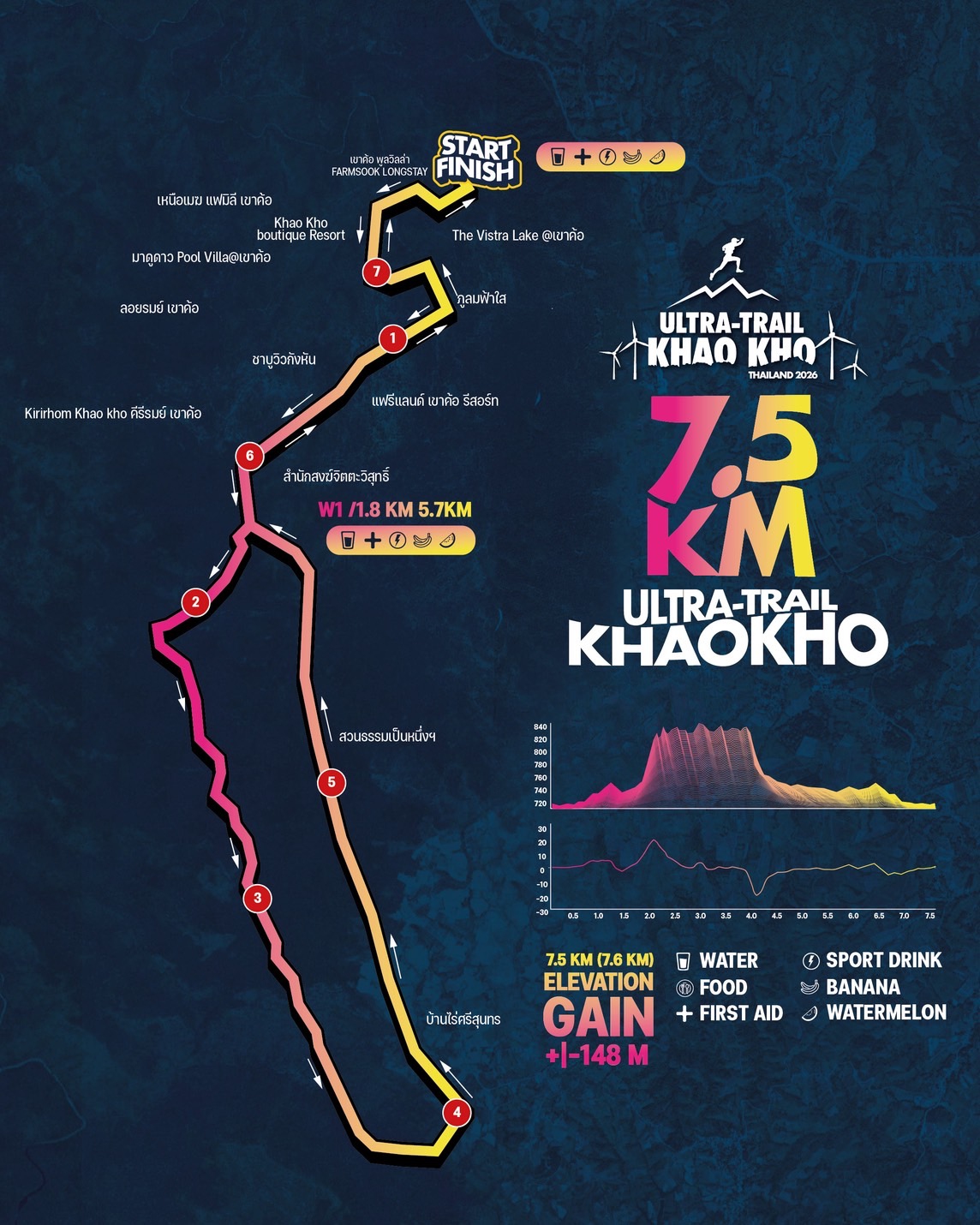 - 7.5 KM มีจุดให้น้ำทุก 2-3 กม. (Elevation +|-148 m)