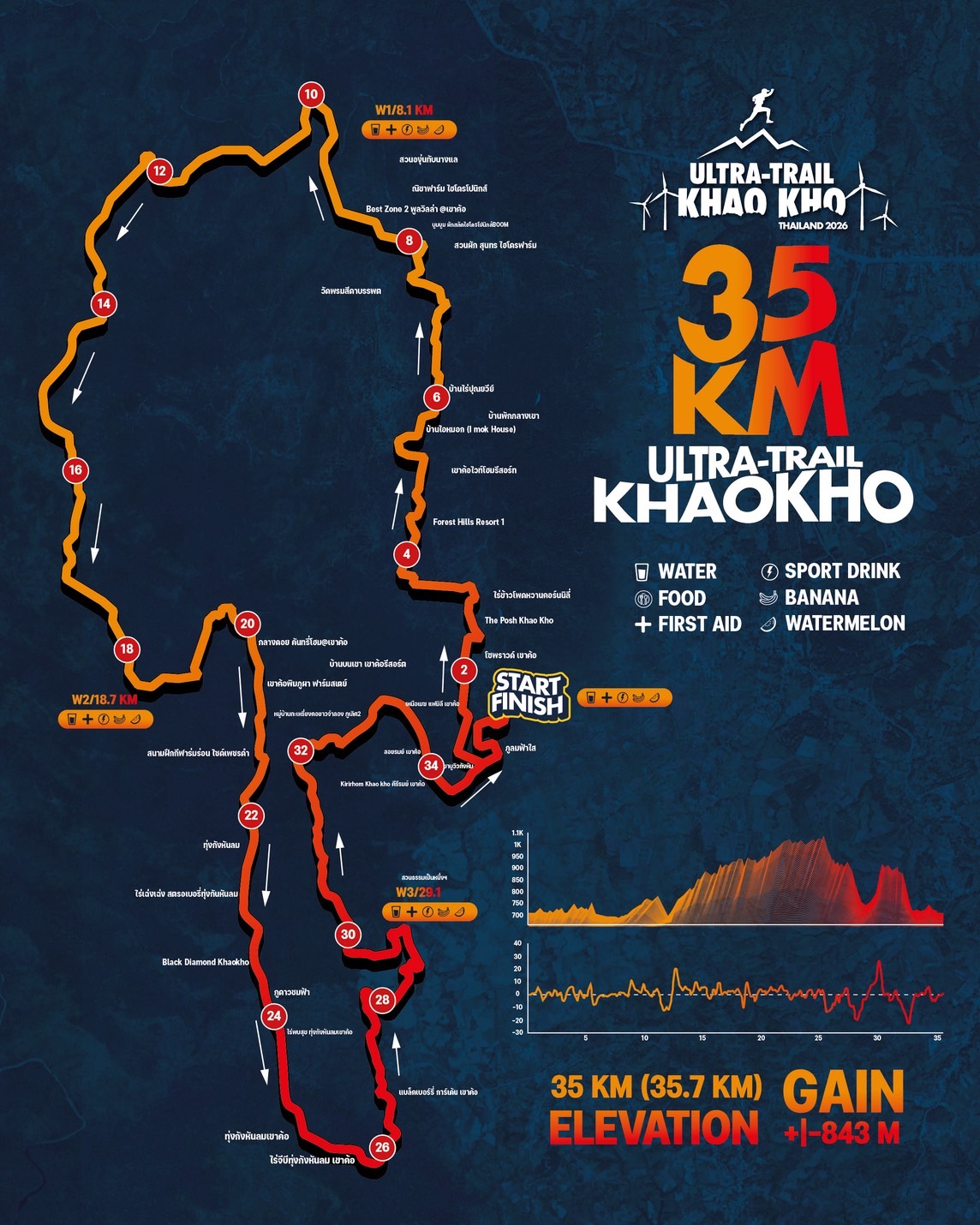 - 35KM (ระยะจริง 35.7KM) Cutoff 8 ชม. บังคับเป้น้ำหรืออุปกรณ์ใส่น้ำ มีจุดให้น้ำทุก 8-10 กม. ( Elevation +-843m)