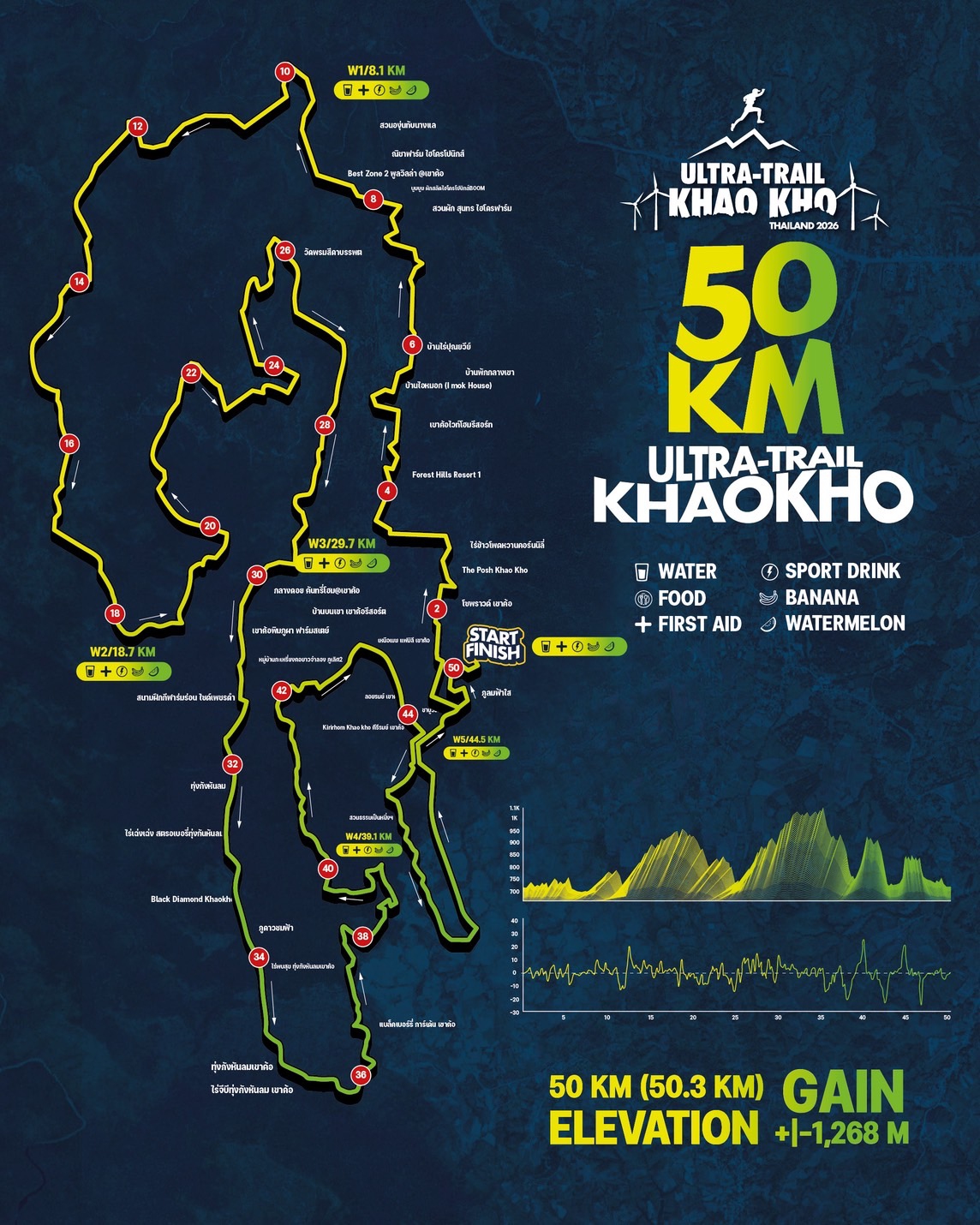 - 50KM (ระยะจริง 50.3KM) Cutoff 12 ชม. บังคับเป้น้ำมีจุดให้น้ำทุก 8-10 กม.(Elevation +-1,268 m)
